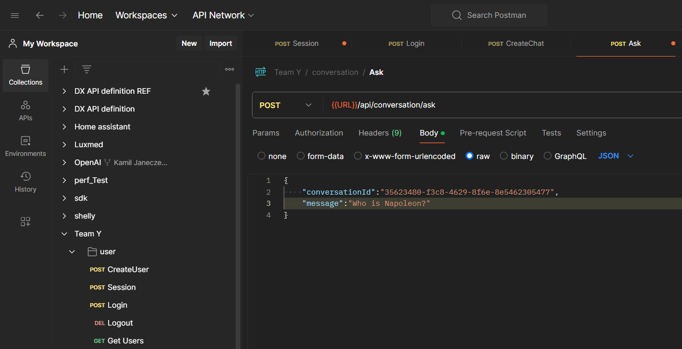 Team Y application is a backend for AI assistant. It is fronted agnostic with user experiance in mind, only just a few of endpoint when interacting with assistant. Main features supported: