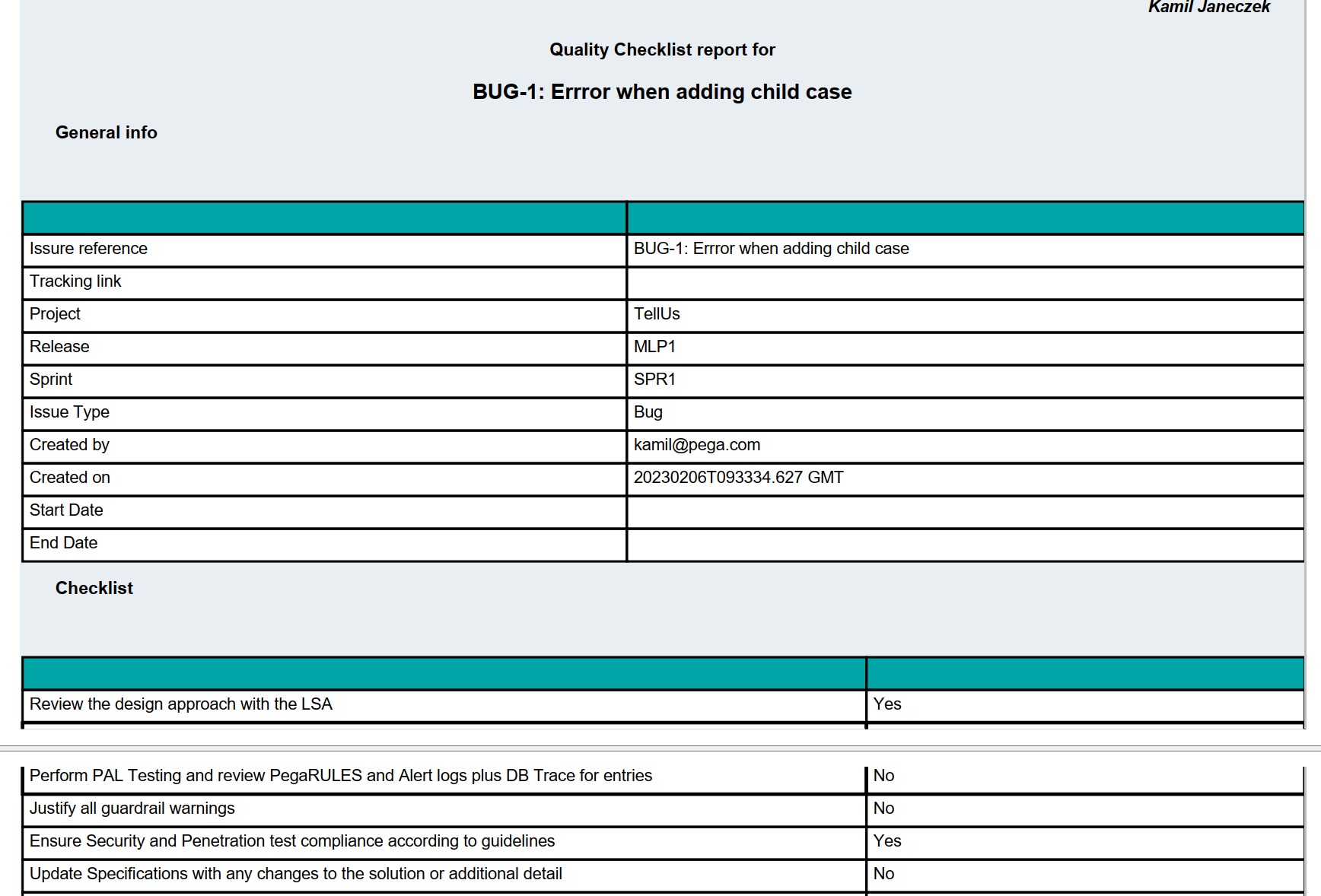The idea behind this application is to give project manager and/or a LSA a tool to keep track of quality related efforts in a project. Generated PDF, as an output of Quality Checklist workflow, can serve as proof of meeting quality best practices. Typically such document is hand-over to client on sprint closure.