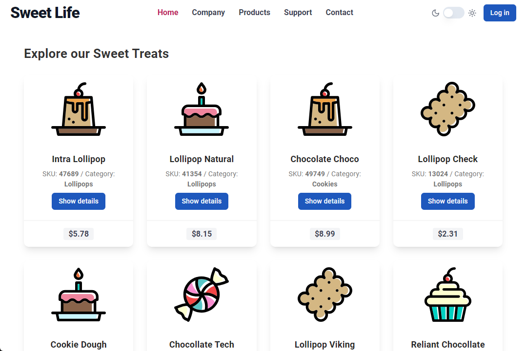 - Poducts page with list of products. Product data comes from Pega